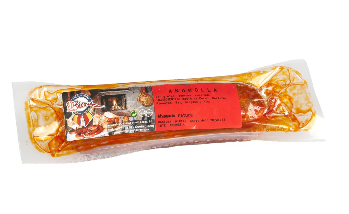 Descubre la androlla del Bierzo, un embutido semi-fresco con un sabor profundo y característico, elaborado artesanalmente siguiendo la receta tradicional. Se compone de magro y piel de cerdo adobados con pimentón, sal y ajo, y posteriormente ahumado lentamente con leña de roble. Es el acompañante perfecto del botillo y un manjar por sí solo.